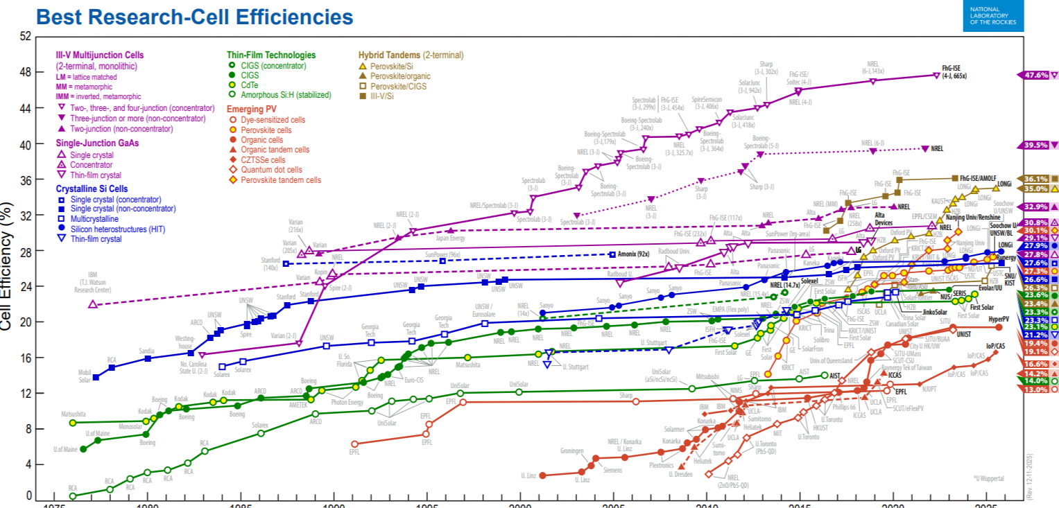 Seit Jahrzehnten dokumentiert diese Übersicht die weltweit höchsten Wirkungsgrade von Solarzellen und macht technologische Durchbrüche – etwa bei Perowskit-Silizium-Tandemzellen oder hochentwickelten Siliziumzellen – transparent. Das Chart wird traditionell vom bekannten US-Forschungslabor NREL gepflegt. Am 1. Dezember 2025 hat das US Department of Energy jedoch den Namen des Instituts von National Renewable Energy Laboratory zu National Laboratory of the Rockies geändert. Nach Angaben des Department of Energy soll der neue Name die erweiterte Mission des Labors unter der Trump Administration widerspiegeln. Unabhängig von dieser Namensänderung bleibt das Effizienzdiagramm eine der wichtigsten Referenzen der globalen Solarbranche – und zeigt Jahr für Jahr, wie schnell sich die Leistungsfähigkeit von Solarzellen weiter verbessert.