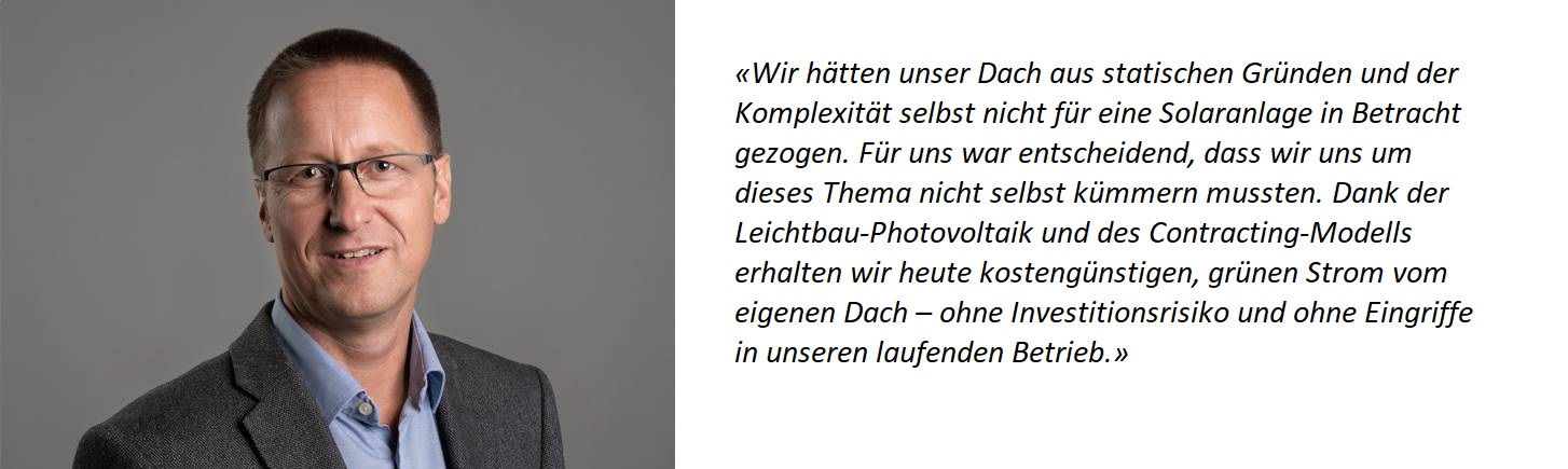 Besonders wichtig war uns, dass die Solarmodule nicht direkt auf die Dachfolie geklebt wurden. Stattdessen kamen speziell entwickelte Schienen zum Einsatz, die auf der Dachfolie befestigt wurden, während die PV-Module anschliessend auf diese Schienen verklebt wurden. Dieses Konstruktionsprinzip ermöglicht eine kontrollierte Hinterlüftung der Module, reduziert die thermische Belastung der Dachabdichtung und trägt wesentlich zur langen Lebensdauer der gesamten Dach- und PV-Konstruktion bei. Gleichzeitig erlaubt es ein vereinfachtes Entfernen einzelner Module im Falle von Defekten – ein entscheidender Vorteil für den nachhaltigen Betrieb von Photovoltaikanlagen auf Industrie- und Gewerbedächern mit geringer Traglast. Wir sind gespannt auf die langfristigen Ergebnisse dieser Lösung.