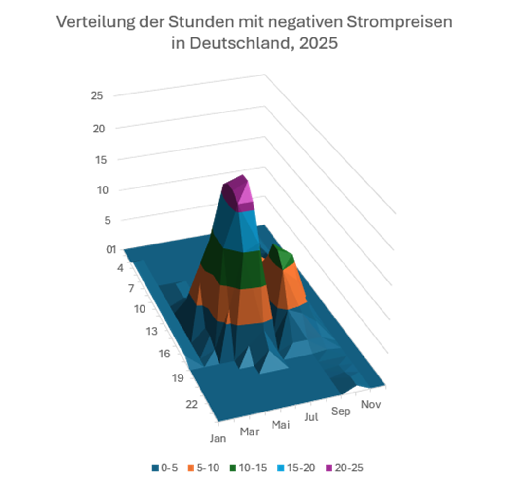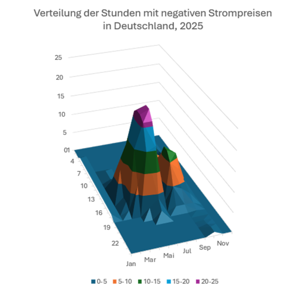 (Grfik: Verteilung der Stunden mit negativen Strompreisen in Deutschland, 2025)